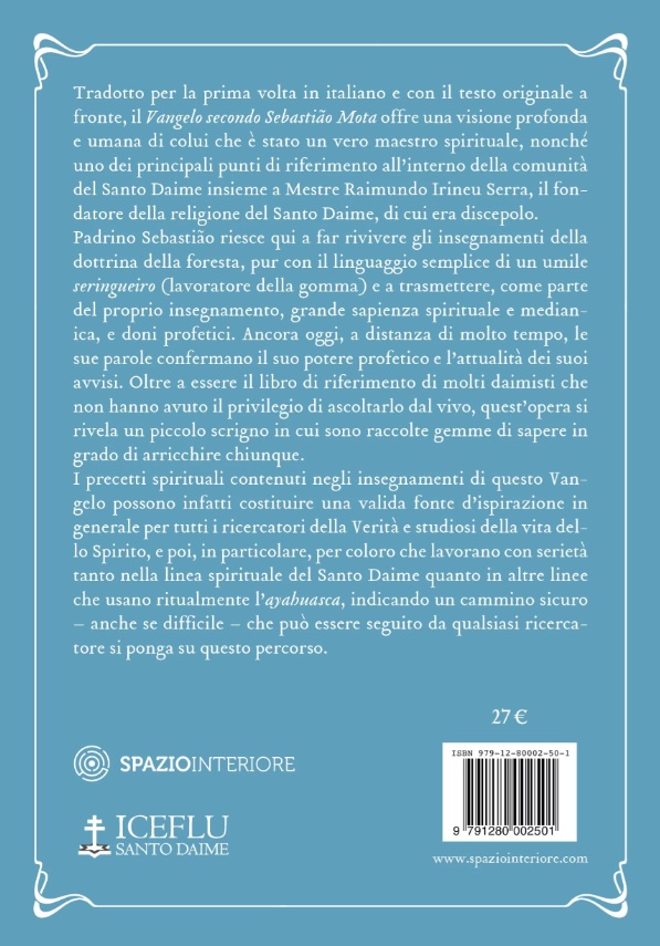 Il suo Vangelo ā per la prima volta tradotto in italiano, con testo originale a fronte ā racchiudeĀ gli insegnamenti della dottrina della forestaĀ e i precetti spirituali qui contenuti sono una valida fonte dāispirazione per tutti coloro che lavorano con serietĆ tanto nel Daime quanto nei rituali con lāayahuasca.